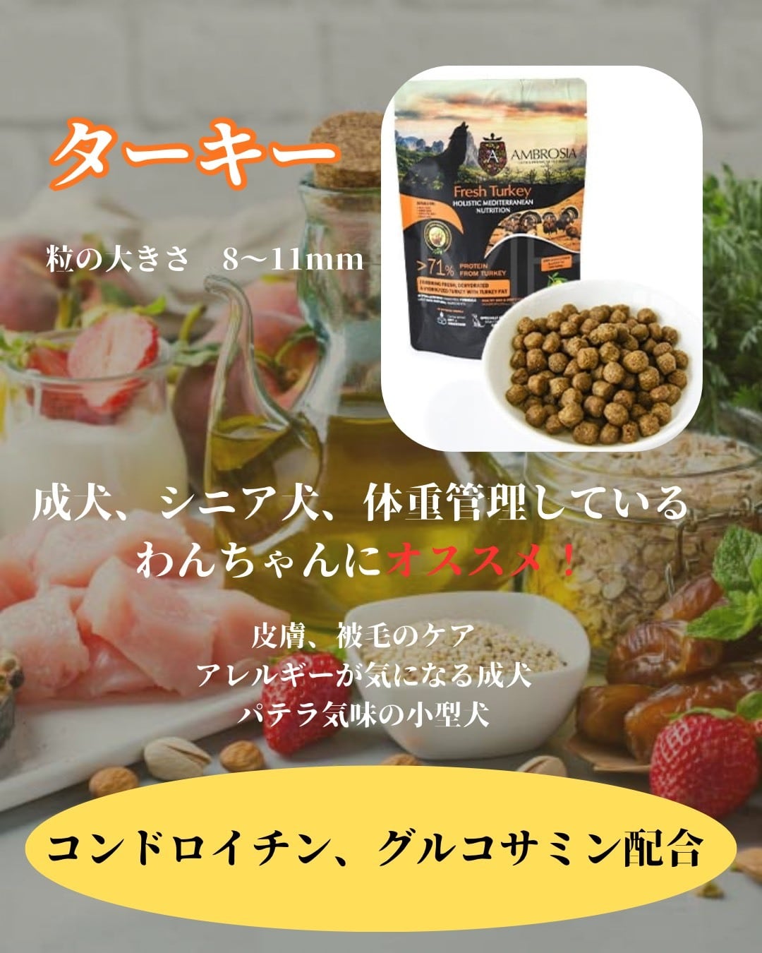 ターキー(30%)、サツマイモ、ドライターキータンパク(14%)、エンドウ豆、ターキーの脂肪(4%)、加水分解されたターキータンパク(3%)、ドライルツェルン、ビートパルプ、ドライチコリ(イヌリンとフルクトオリゴ糖の供給源として;1%)、オリーブオイル(0.5%)、亜麻仁、塩化コリン、MSM(メチルスルホニルメタン;0.15%)、タウリン、塩酸グルコサミン(500mg/kg)、コンドロイチン硫酸塩(250mg/kg)、ドライアップル、ドライトマト、フェヌグリーク、ドライ梨、ドライオレンジ、オレガノ、タイム、プロバイオティクス(エンテロコッカス・フェシウム)、ビタミンE(一部保存料として)、ビタミンC、亜鉛、鉄、マンガン、ビタミンB12、ビオチン、ナイアシン、パントテン酸、ビタミンA、ビタミンB2、銅、ビタミンB1、ビタミンB6、ヨウ素、葉酸、セレン、ビタミンD3